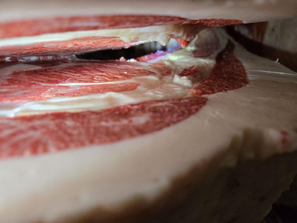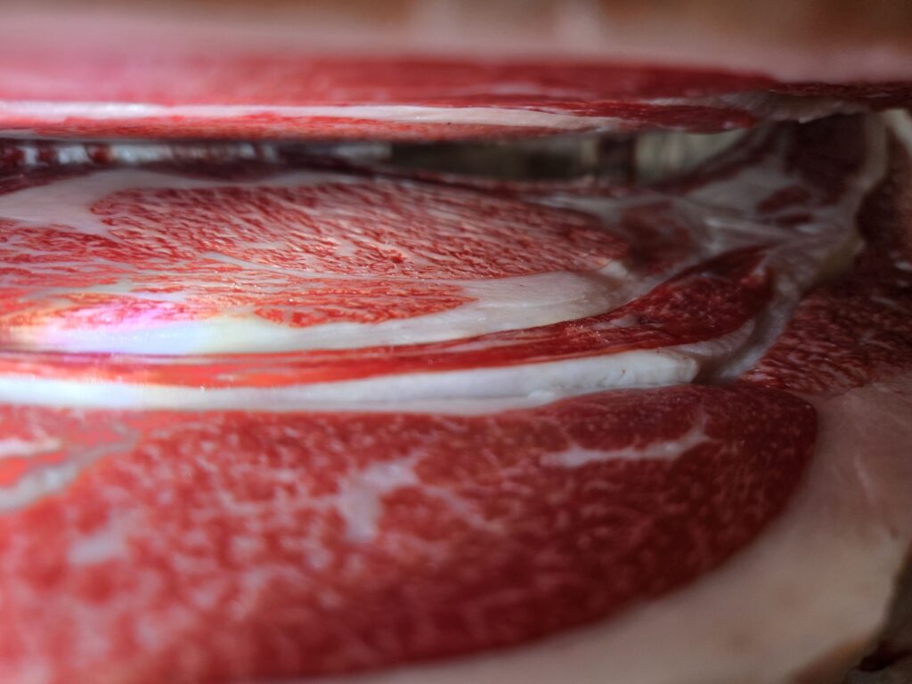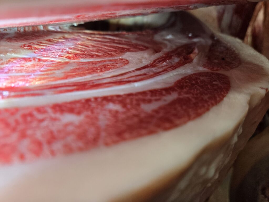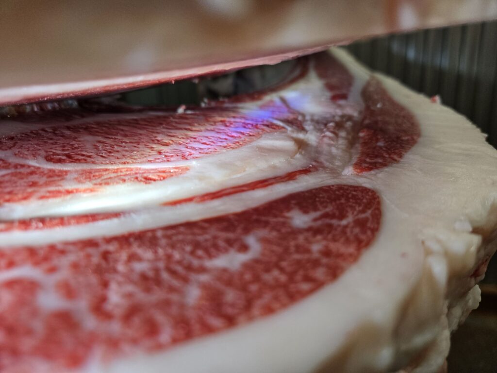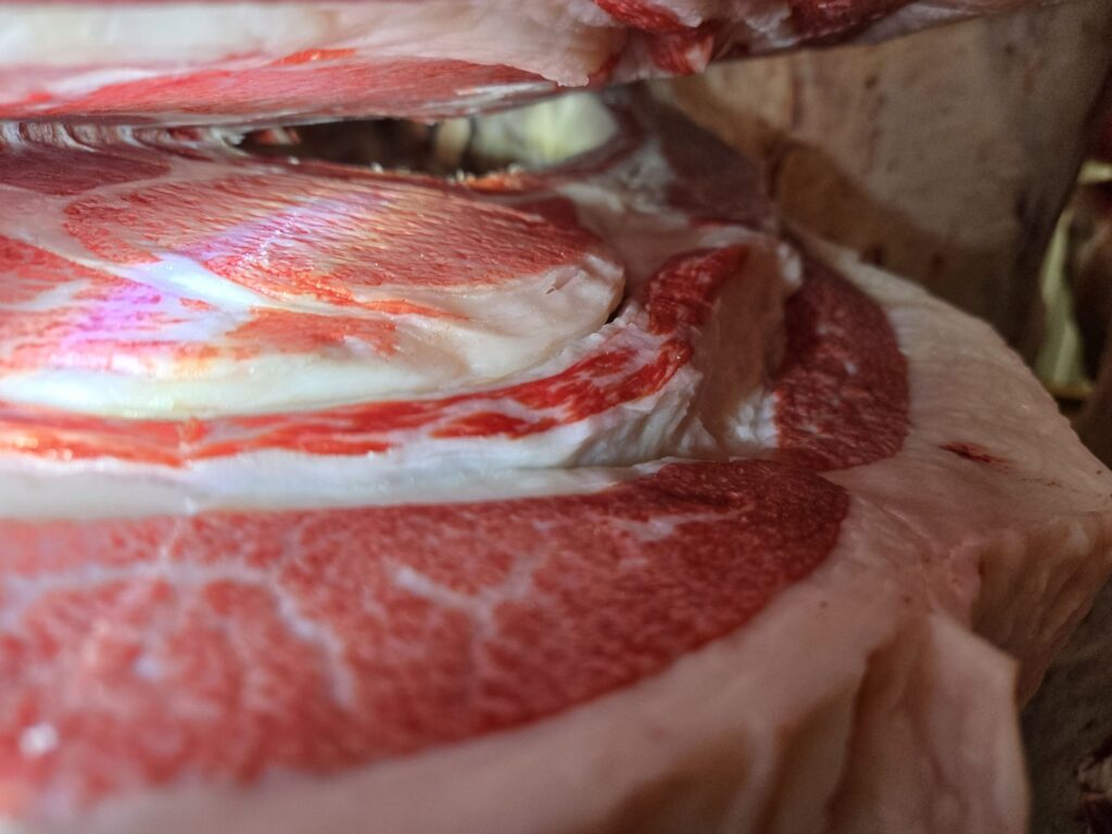 少し小さめですが、肉色濃く脂も柔らかく美味しそうな枝肉でした。弊社で育った牛です。こちらは坂元農場精肉店osakaで使用しておりますのでぜひお問い合わせくださいませ。